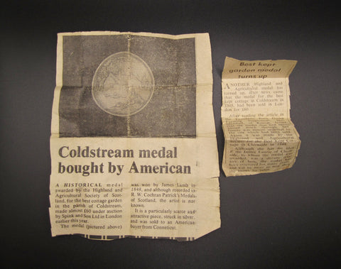 This medal is accompanied by two old paper cut outs, one of which details the sale of a similar medal via Spink, that was sold to an American buyer from Connecticut, and the other reporting on this medal, which was rediscovered by a Mrs Marshall, after reading the other article.