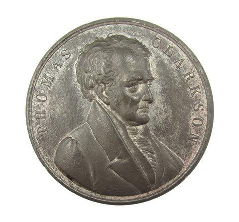 Obverse with bust of Thomas Clarkson, reverse with a slave kneeling with his manacled hands raised.