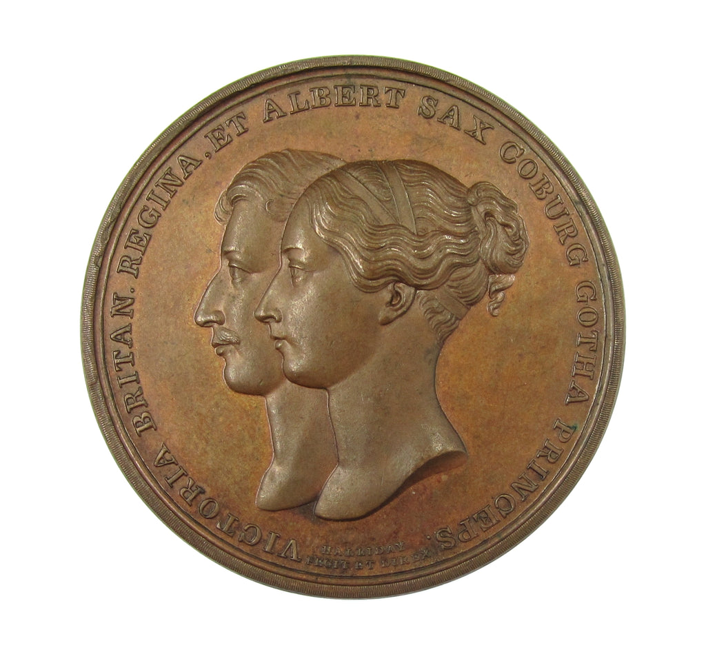 Obverse with conjoined busts of Victoria and Albert, reverse with scene of the marriage ceremony.