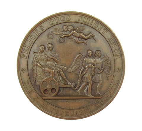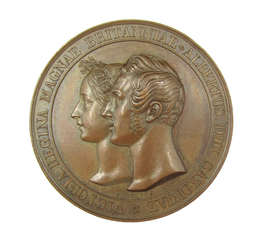 Obverse with conjoined busts of Victoria & Albert, reverse showing the couple seated in an ornate cart, drawn by two angels.