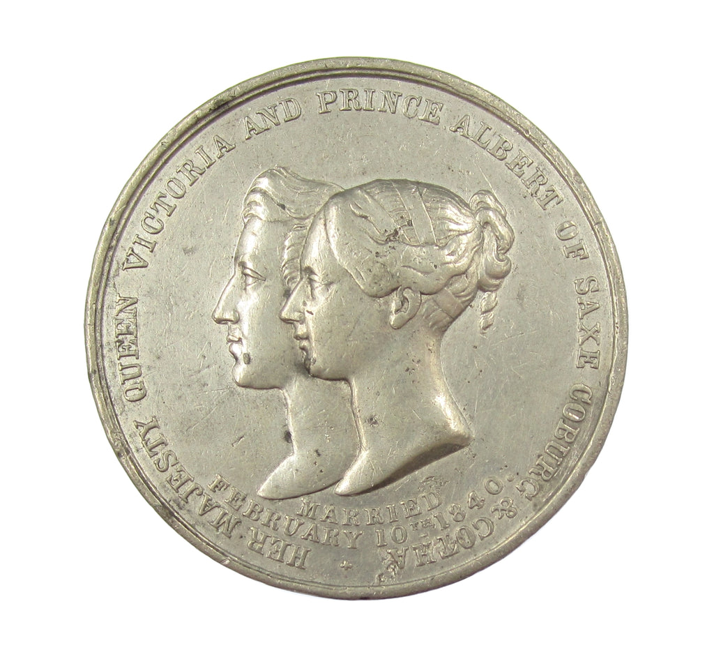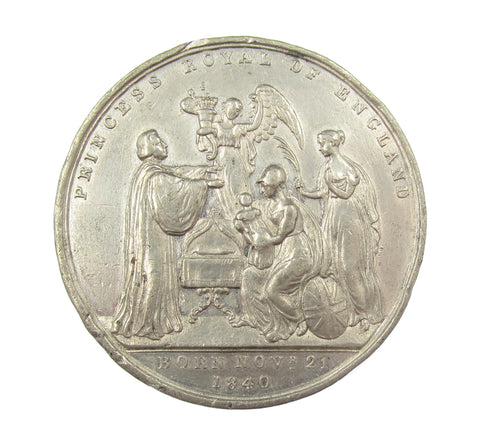 Obverse with conjoined busts of Victoria & Albert, reverse showing clergyman blessing the infant princess held by Britannia standing beside cradle.