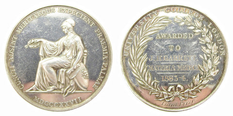 Accompanied by a smaller 38mm University College London silver medal also awarded to J.H Garrett in 1883-84 as a third prize award. By W.Wyon with reverse showing Minerva seated.
