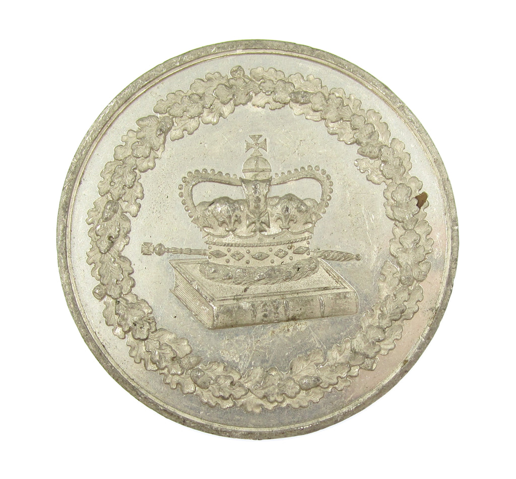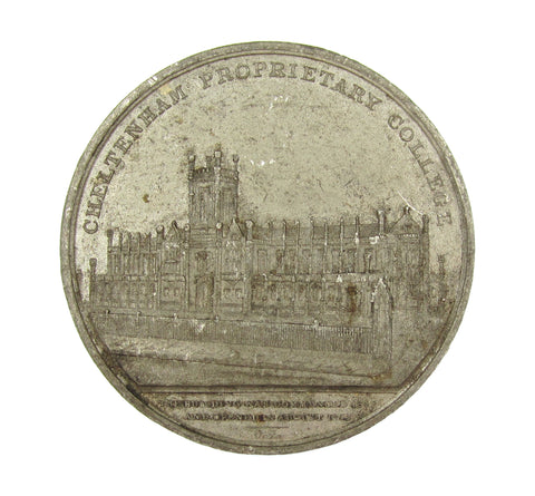 Obverse with view of college buildings, reverse with crown upon bible, within wreath.