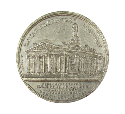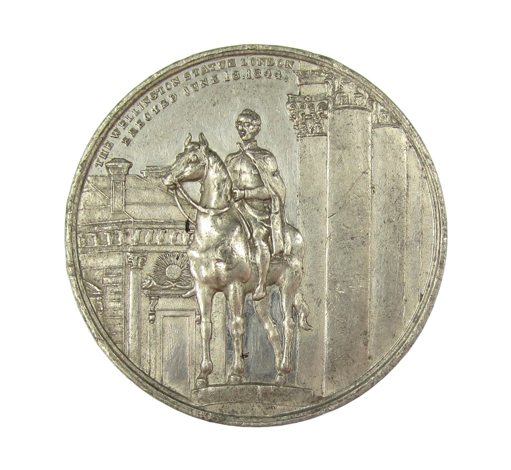Obverse with view of the Royal Exchange Building, reverse with equestrian statue of The Duke of Wellington.