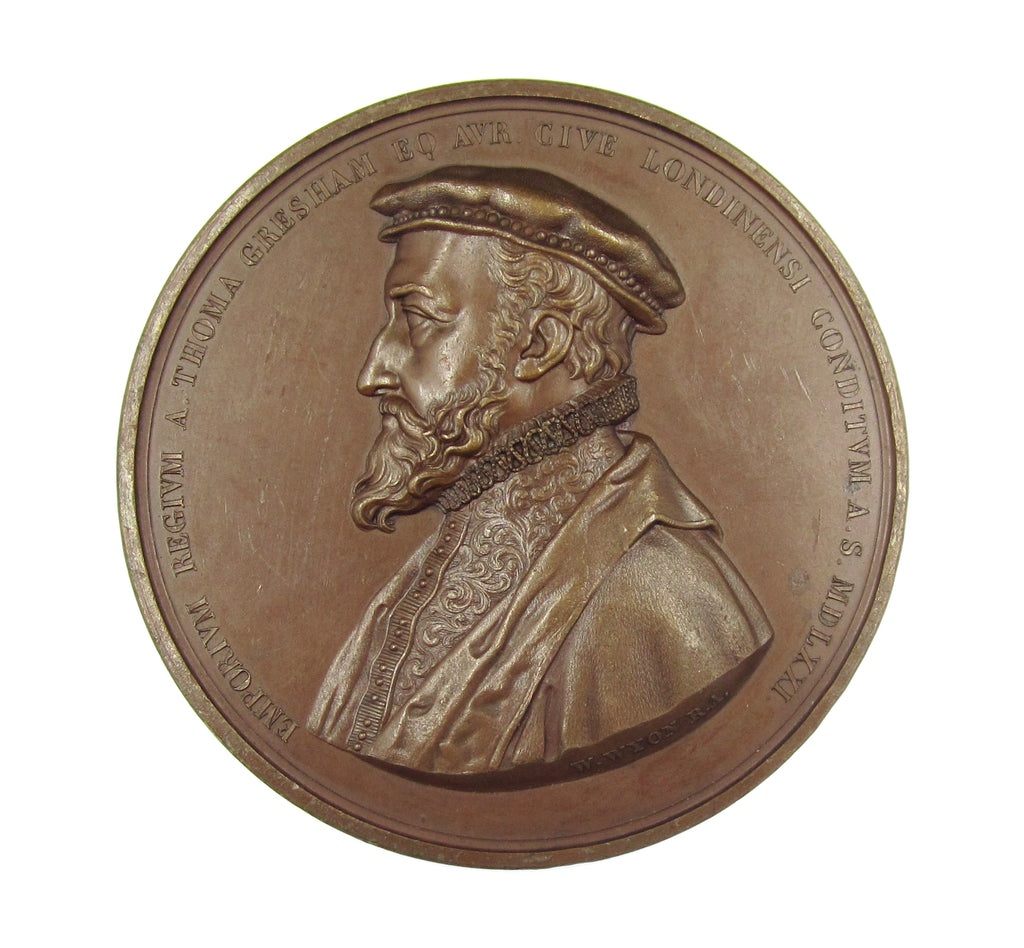 Obverse showing bust of Thomas Gresham and the reverse showing the facade of The Royal Exchange.