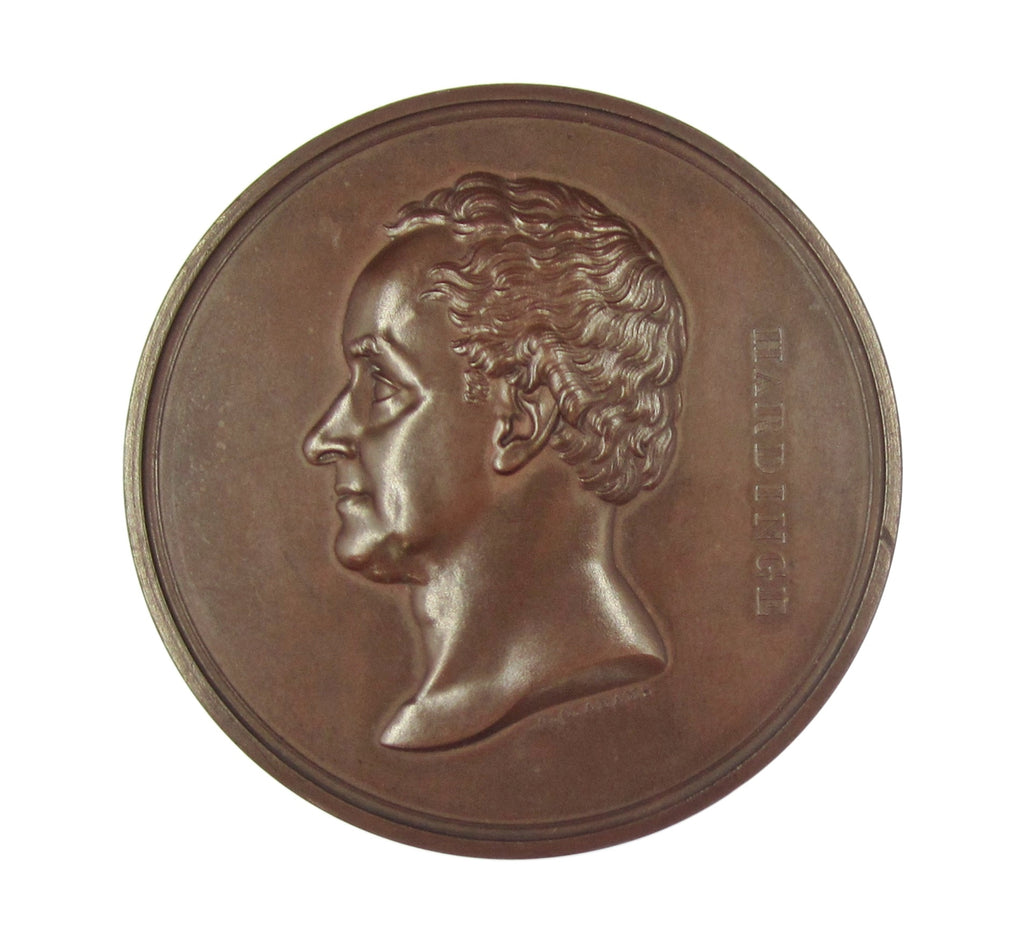 Obverse with bust of Hardinge, reverse with Victory presenting an olive branch to a kneeling warrior.