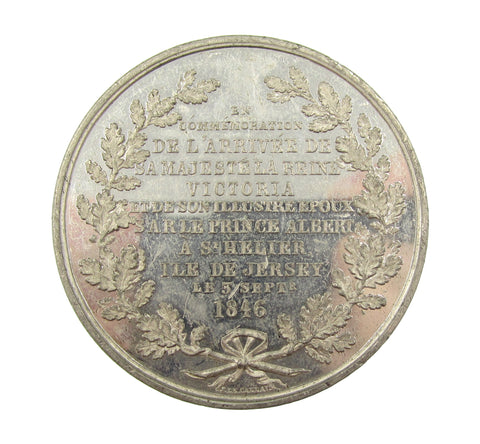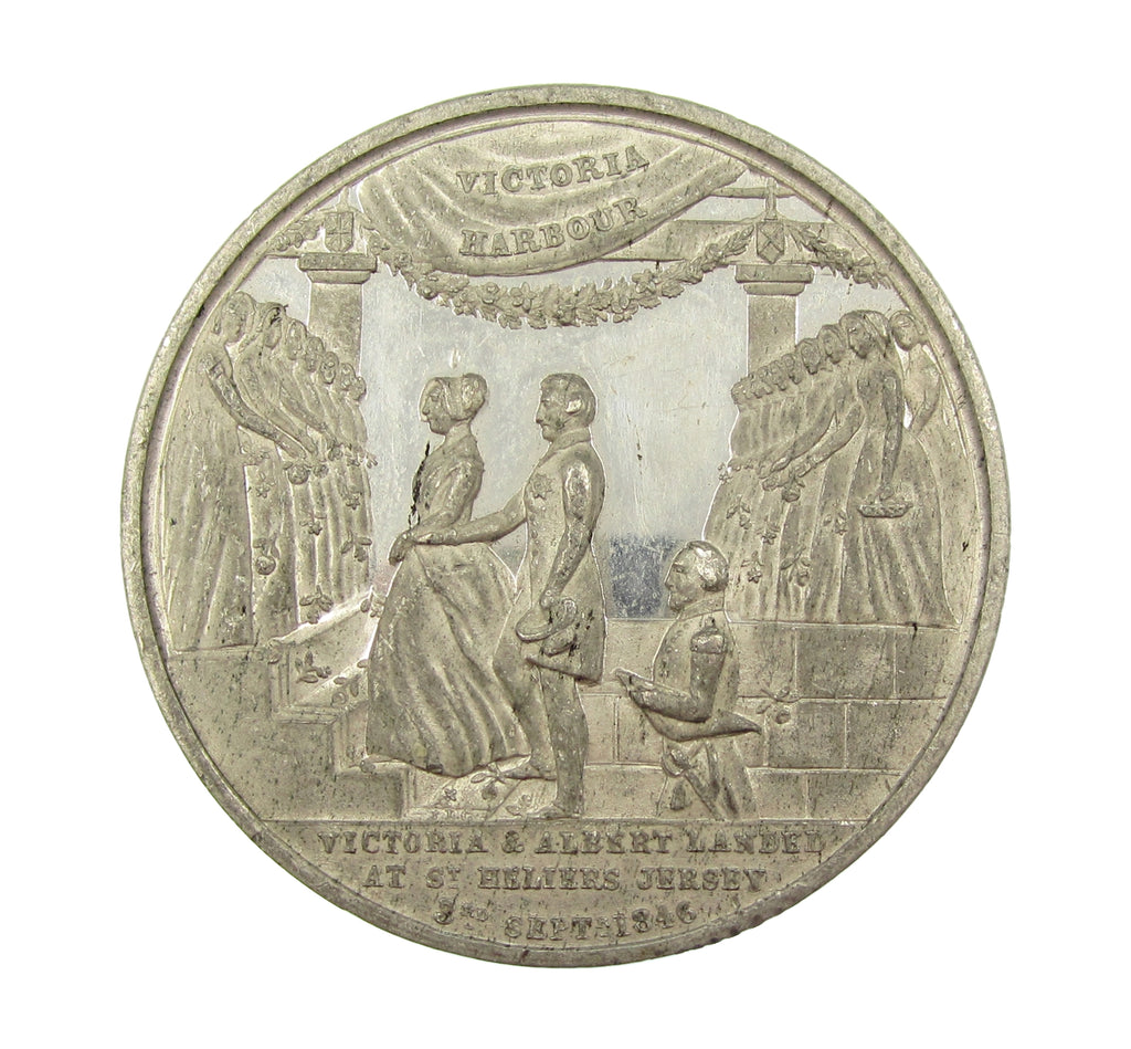 Obverse showing Victoria & Albert mounting steps of the quayside, welcomed by two lines of female figures bearing floral tributes. Reverse with 11 line inscription within wreath.