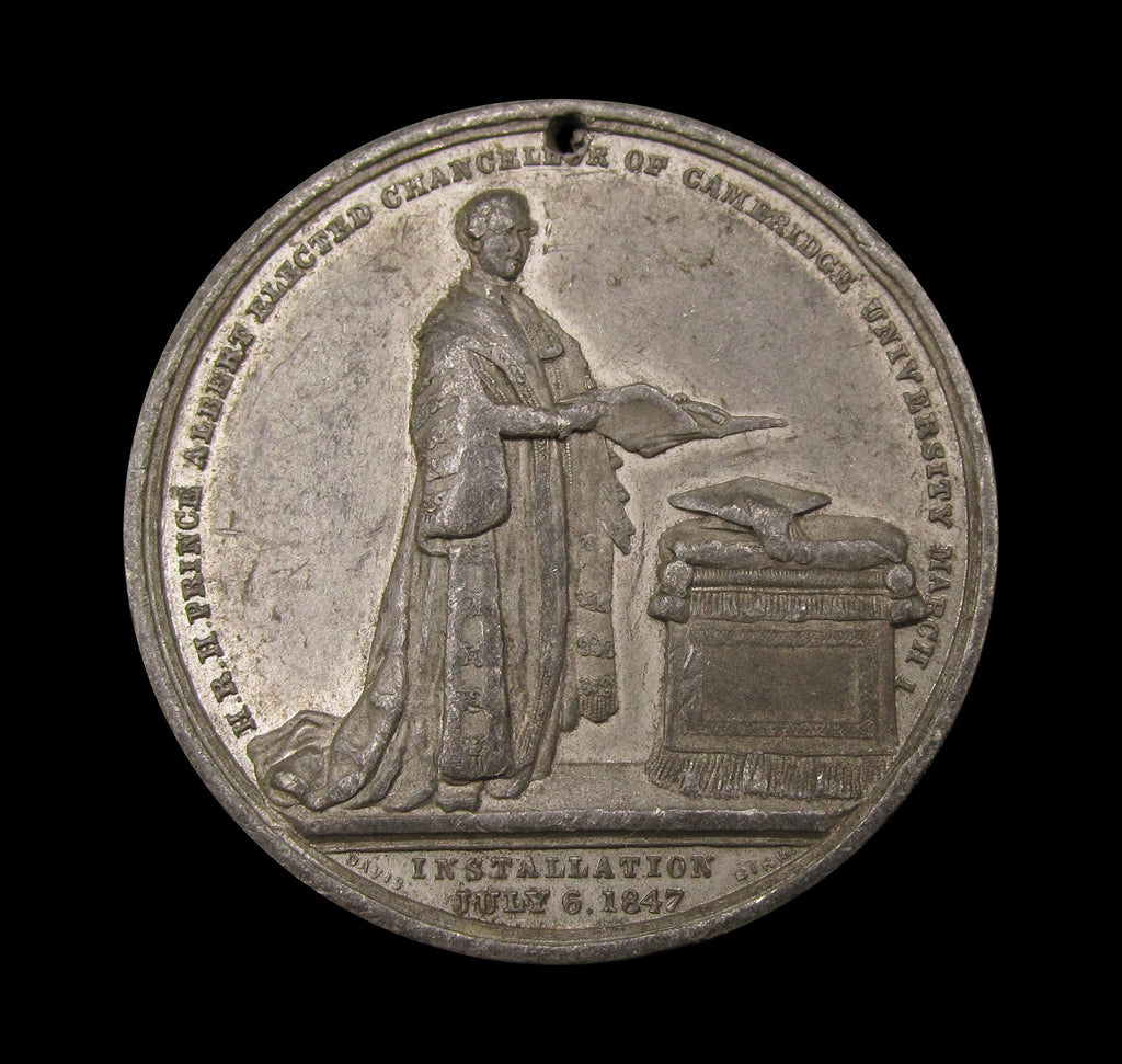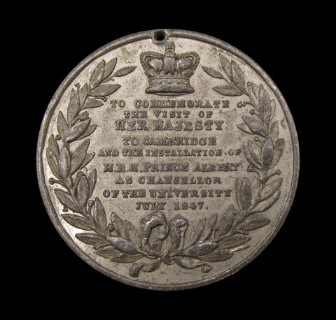 Obverse with crowned inscription within open wreath, reverse with Prince albert reading an address, cap on pedestal.
