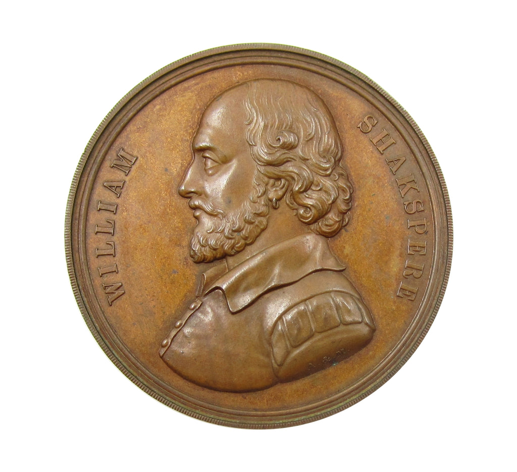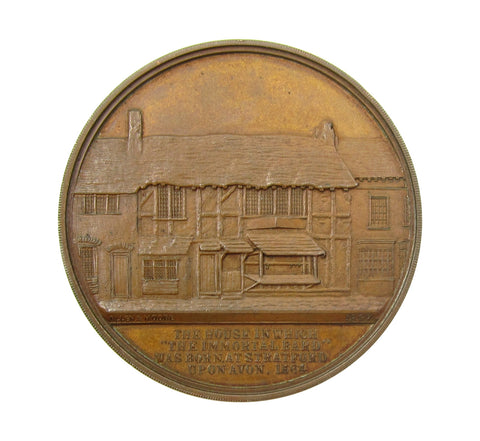 Obverse with bust of William Shakespeare, reverse with view of his birthplace home, legend in exergue below.