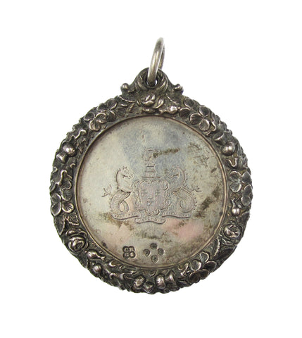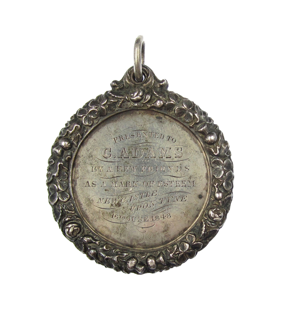 Presentation medal. Obverse with coat of arms for Newcastle and hallmarks, reverse engraved 'Presented to C. Adams by a few friends as a mark of esteem, Newcastle Upon Tyne, 16th June 1848. Surrounded by attractive floral border.