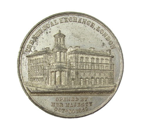 Obverse with crowned bust of Victoria within border, reverse with view of the Coal Exchange. J.B Bunning on exergual line below the building.