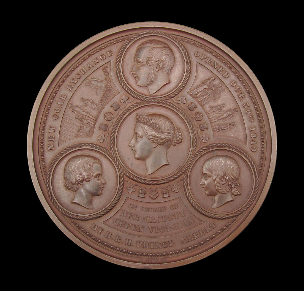 Obverse with central portrait medallion of Victoria, surrounded by those of Prince Albert and The Princess Royal. Reverse showing an incredibly detailed interior of the Coal Exchange.