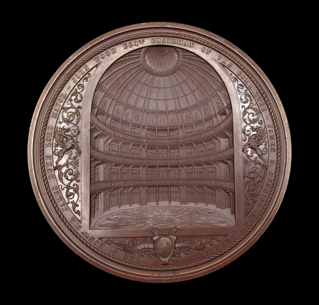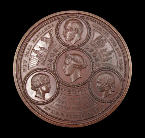Obverse with central portrait medallion of Victoria, surrounded by those of Prince Albert and The Princess Royal. Reverse showing an incredibly detailed interior of the Coal Exchange.