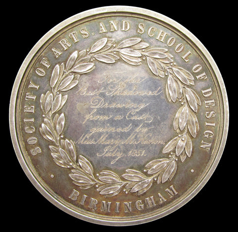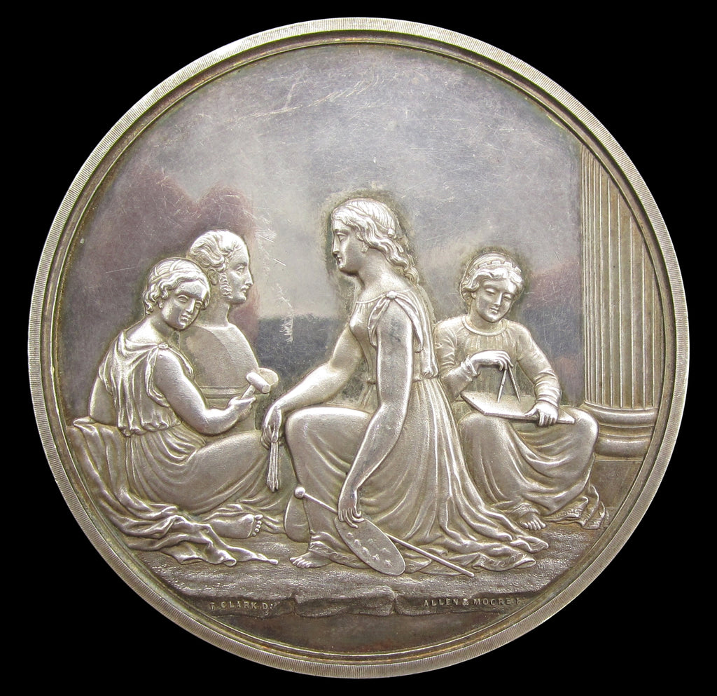 Obverse with three female students of architecture, painting and sculpture, the latter carving a bust of Prince Albert. Reverse with legend surrounding wreath and within wreath the engraved inscription, “For the Best Shadowed Drawing from a cast gained by Miss Mary M Hutton, July 1851”.