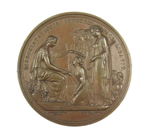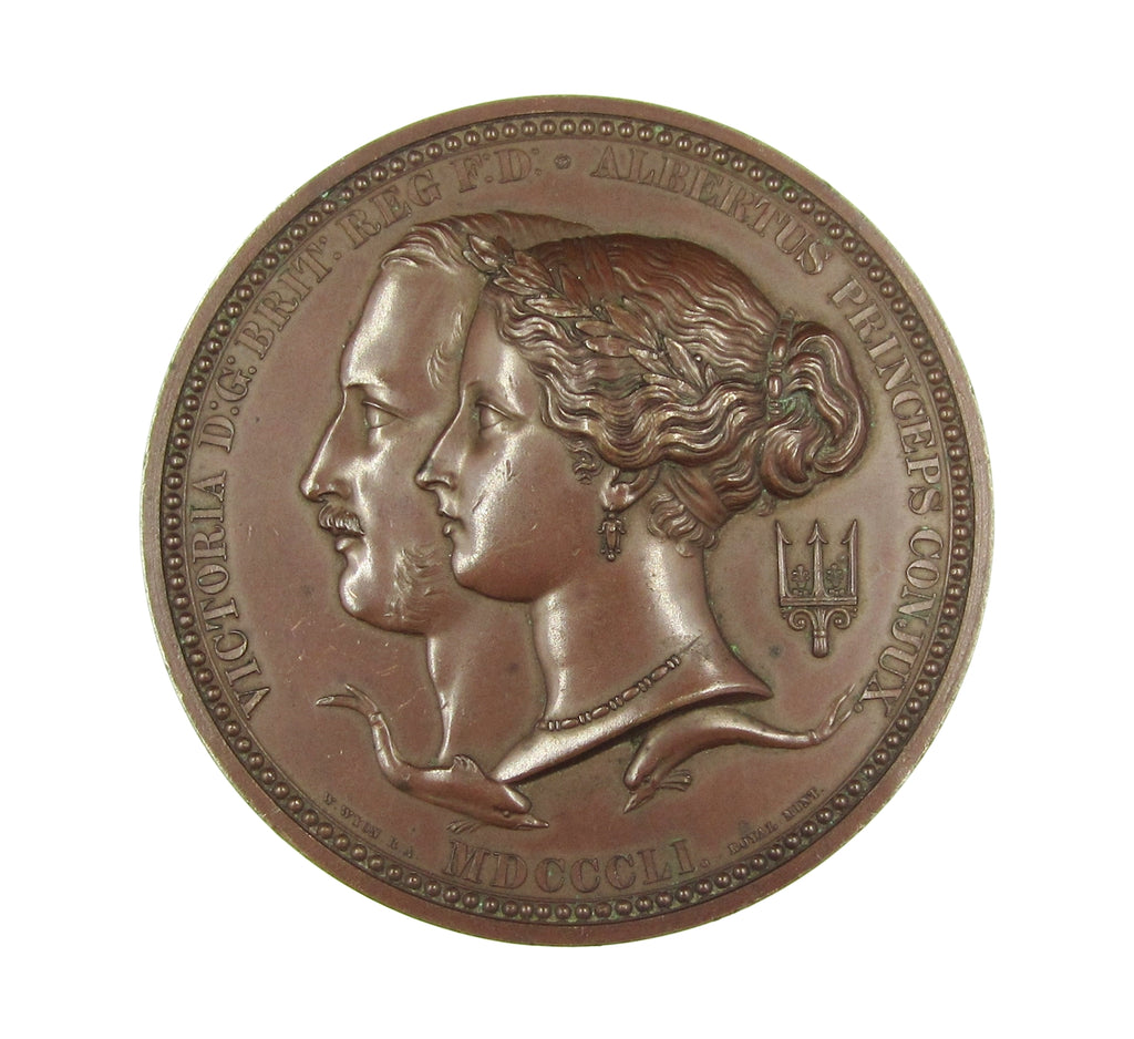 Obverse with conjoined busts of Victoria and Albert, reverse with Britannia seated, confers a wreath upon the head of Industria. Edge reads 'Prize Medal Of The Exhibition, F.M.C Leal. Class IV'.