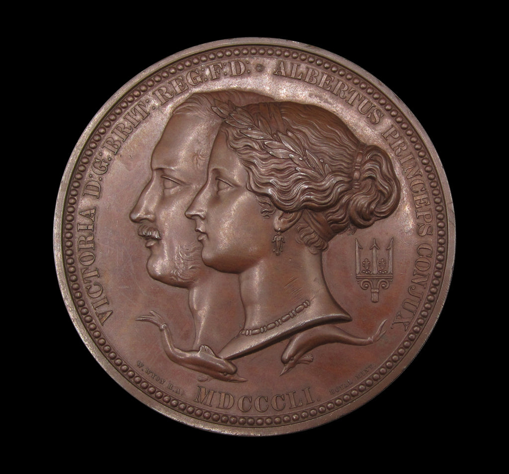 Obverse with conjoined busts of Victoria and Albert, reverse with Britannia seated, confers a wreath upon the head of Industria. Edge reads 'Prize Medal Of The Exhibition, Maria Sturmy. Class XIX.'