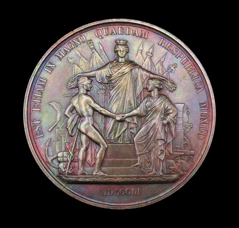 Heavy edge knock at 2 o'clock on obverse otherwise Extremely Fine with a nice olive tone and very rare. By far the rarest of the 1851 Great Exhibition Medals with only 174 awarded, compared with 2918 prize medals.