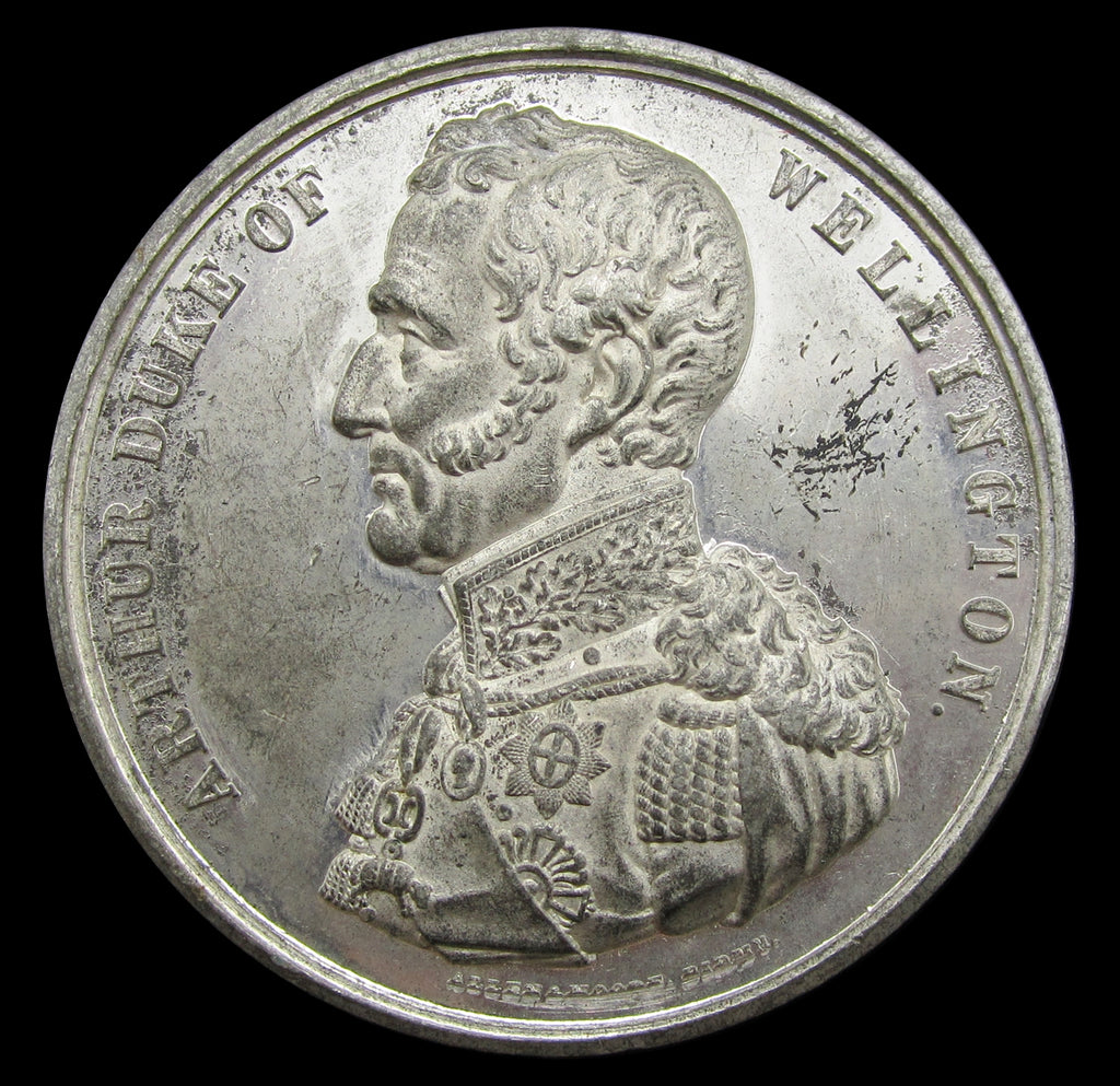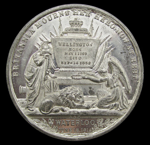Obverse with uniformed bust of Arthur Duke of Wellington, reverse with Britannia mourning at a funerary urn, underneath the words 'Britannia Mourns Her Hero Now At Rest'.