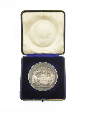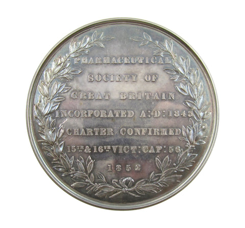 Obverse with two figures standing facing, one in eastern attire, one in ancient attire, holding pharmaceutical implements, flanking garland entwined tablet. Reverse with 7 line inscription within wreath. Edge engraved 'Sydney Smith - Practical Chemistry - 1909'.