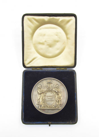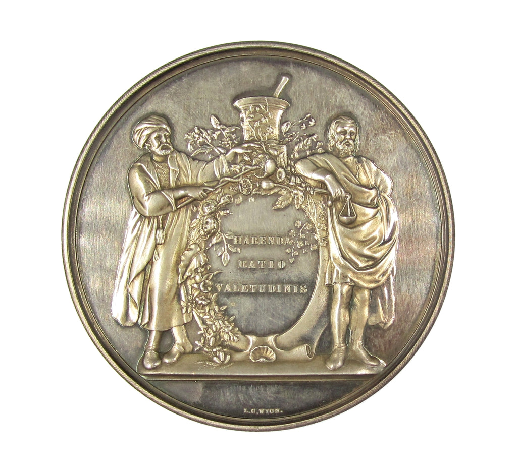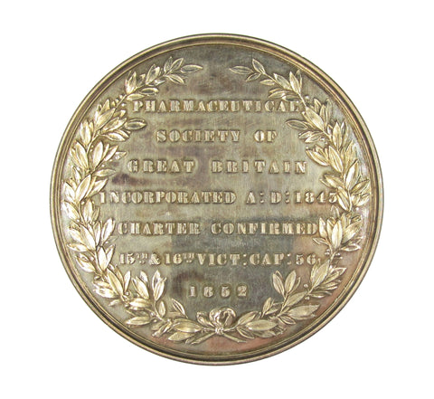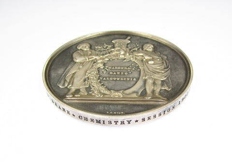 Obverse with two figures standing facing, one in eastern attire, one in ancient attire, holding pharmaceutical implements, flanking garland entwined tablet. Reverse with 7 line inscription within wreath. Edge engraved 'Harold Deane * Chemistry * Session 1900-1*.