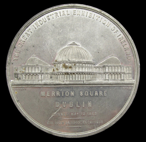 Obverse with view of the Exhibition buildings, reverse with figures representing industries of Europe, Africa, Asia, and America seated on clouds around globe.