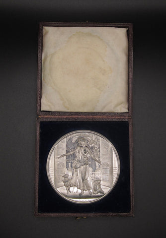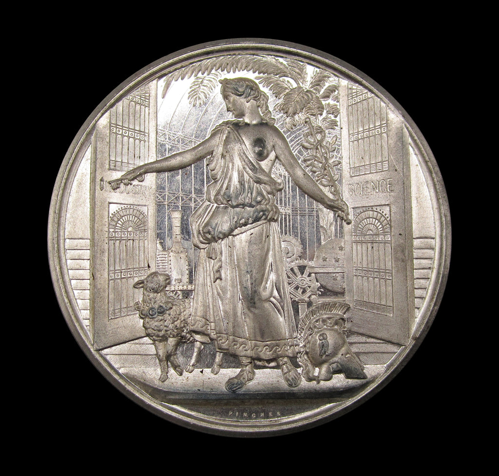 Obverse with Britannia holding caduceus and key, opening the doors to the exhibition, lamb and helmet at her feet, reverse with view of exhibition building.