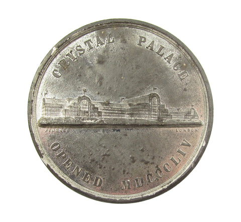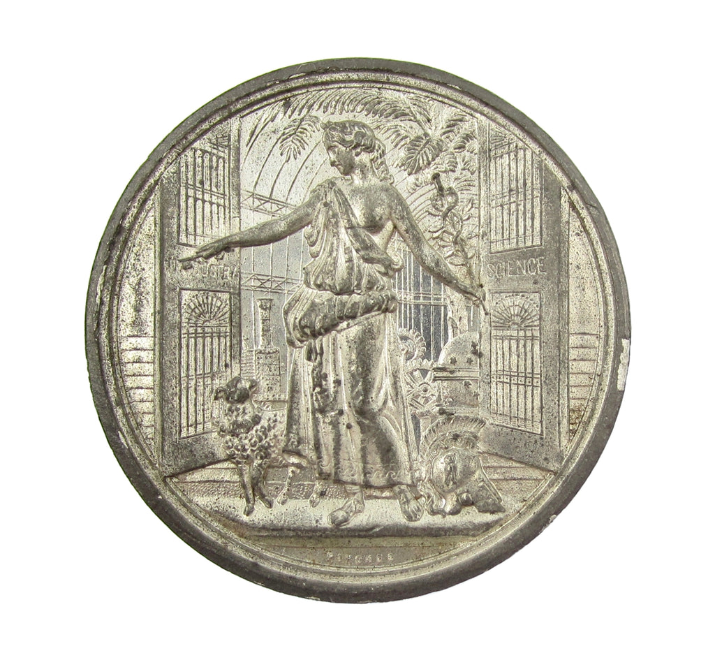Obverse with female figure, lamb and helmet at her feet, opens the door of Industry and Science. Reverse with view of the exhibition building.