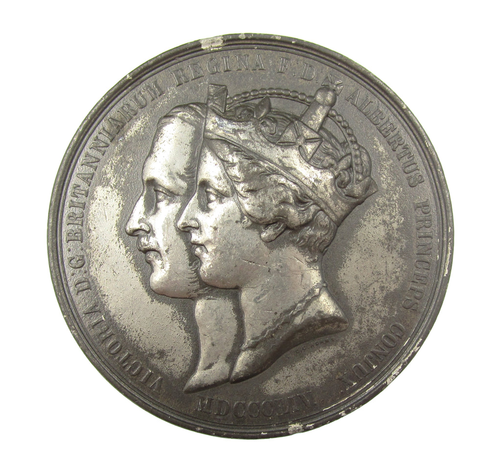 Obverse with conjoined busts of Victoria and Albert, reverse with Britannia standing between the figures of Industry and Commerce.