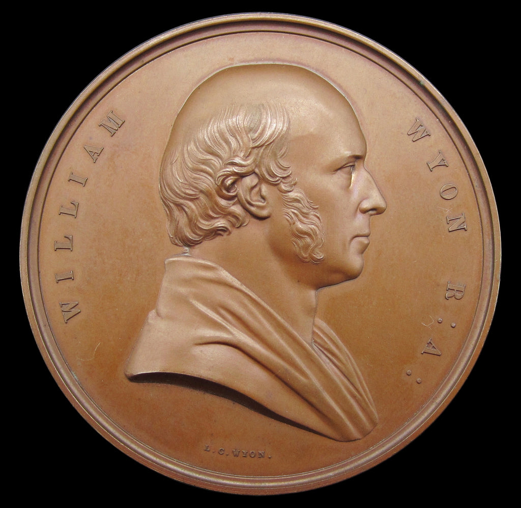 Obverse with draped bust of William Wyon. Reverse showing a representation of Wyon's design; Britannia, holding an olive branch, drives four sea horses.