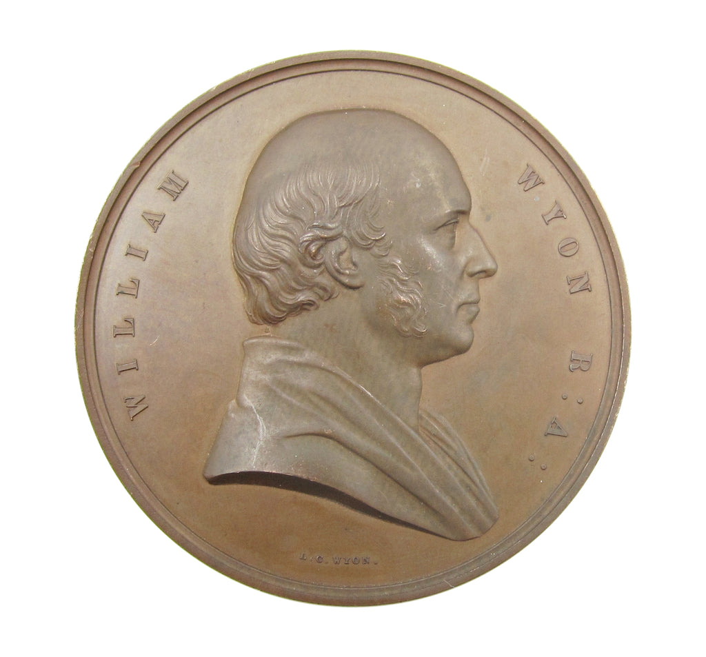 Obverse with draped bust of William Wyon. Reverse showing a representation of Wyon's design; Britannia, holding an olive branch, drives four sea horses.