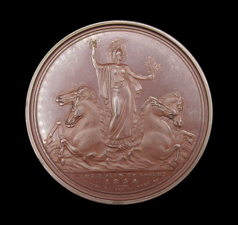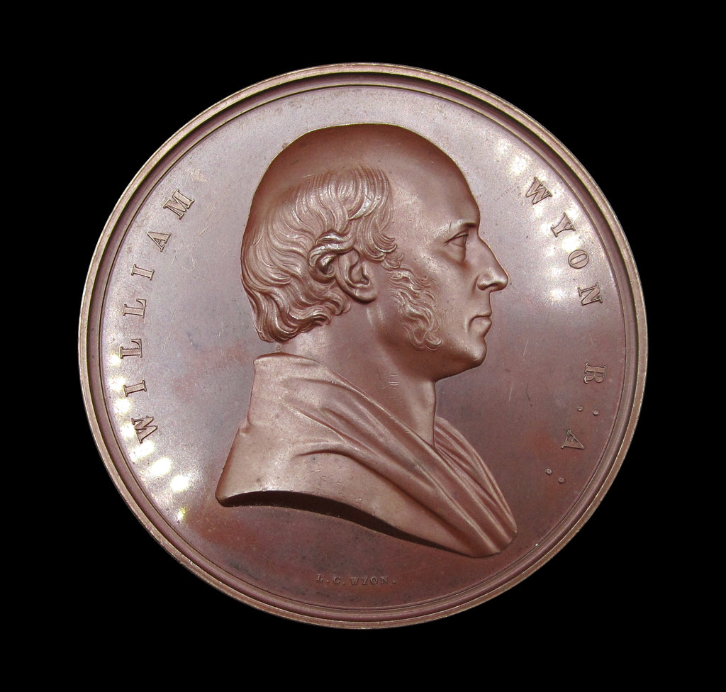 Obverse with draped bust of William Wyon. Reverse showing a representation of Wyon's design; Britannia, holding an olive branch, drives four sea horses.