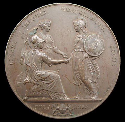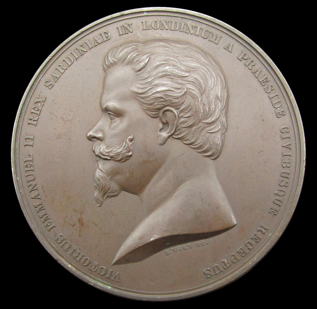 Obverse with bust of Victor Emmanuel II, reverse with Britannia seated, Londinia standing at her side, welcoming the standing figure of Sardinia.