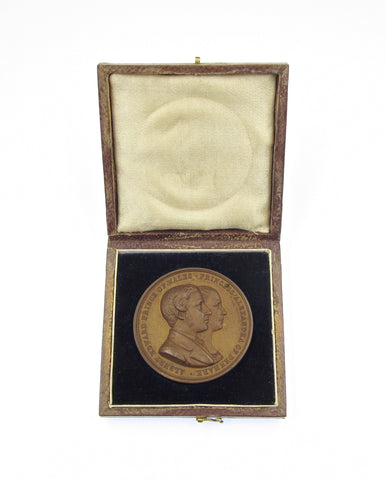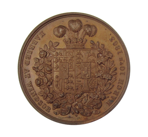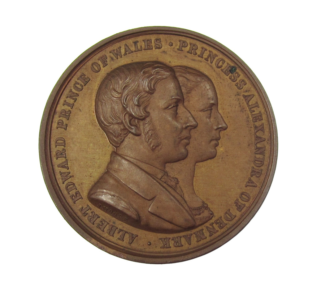 Marriage of the Prince of Wales and Princess Alexandra of Denmark. Obverse with conjoined busts, reverse with arms of the Prince and Princess within wreath, Prince of Wales’ feathers above.