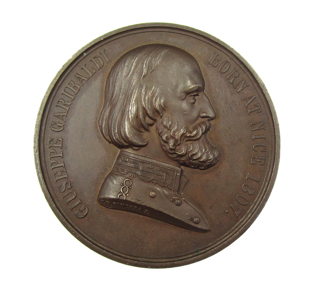Obverse with uniformed bust of Giuseppe Garibaldi, reverse with legend within wreath.