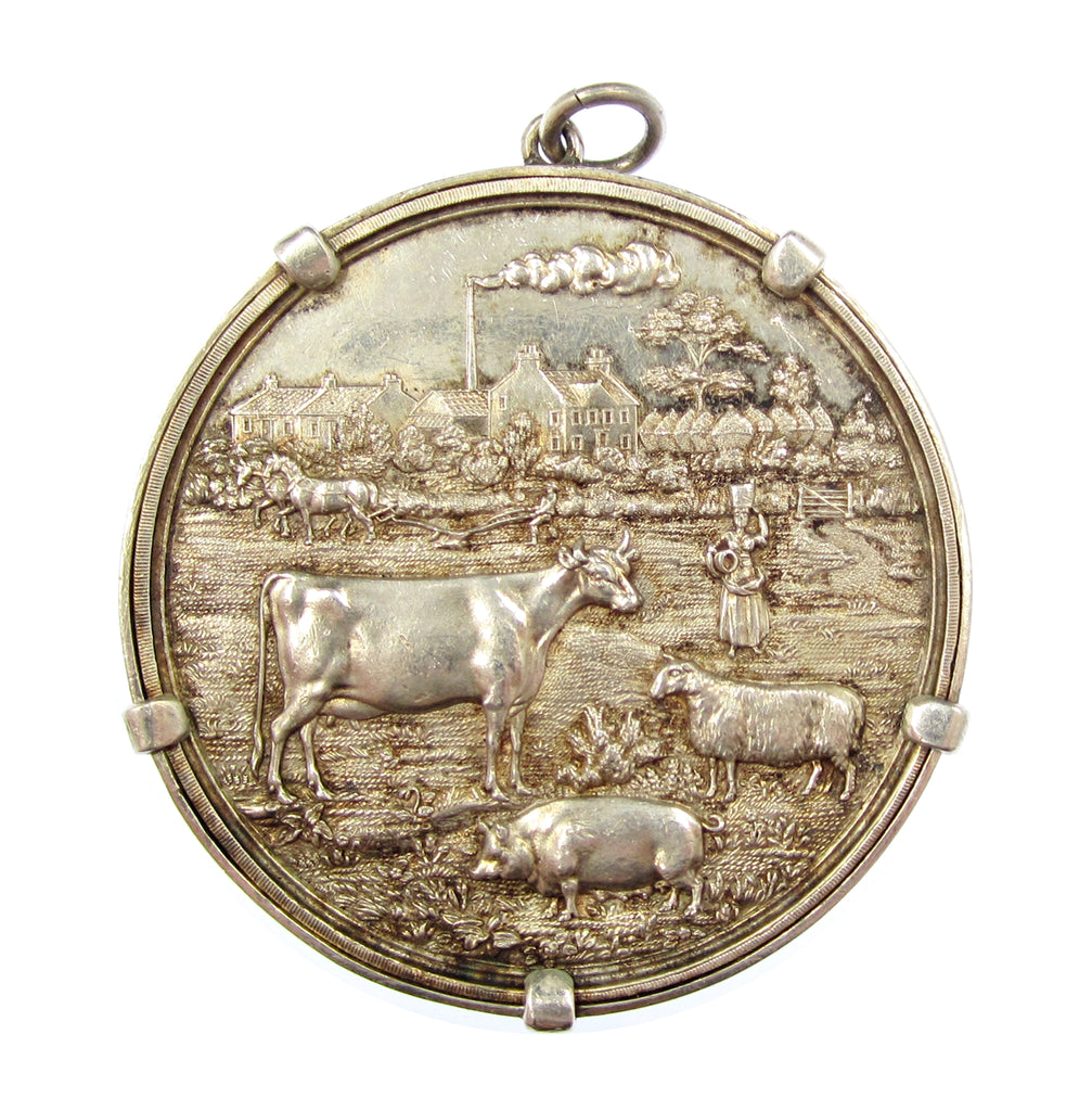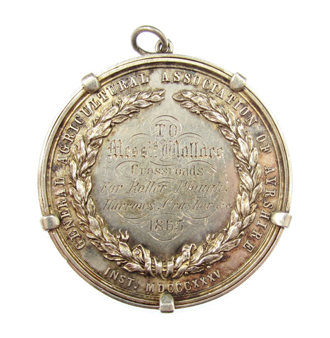 Obverse with farm scene and town and factory in the background. Reverse with legend around wreath and INST MDCCCXXXV (1835) below. Engraved within wreath 'To Messrs Wallace - Crossroads - For Roller, Plough, Harrows, Cruscher &c - 1865'.