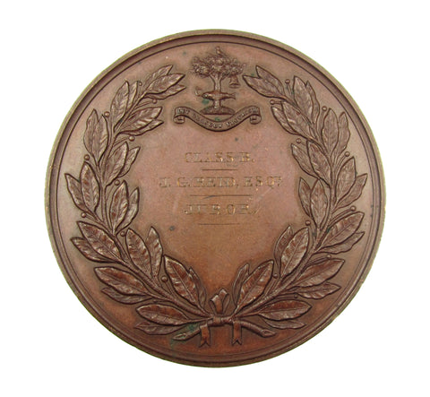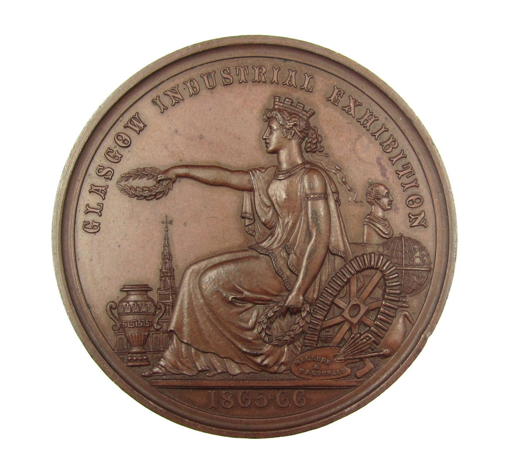Obverse with female seated holding laurel wreaths, man and globe behind painters palette with maclure & macdonald on it. Dated 1865-66 in exergue. Reverse with city arms & motto. Engraved within wreath 'Class B, J.G Reid, Esqr, Juror'.