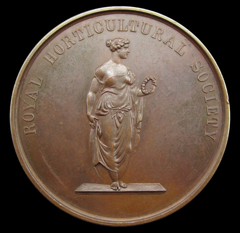 Obverse with bespectacled and draped bust of Dr John Lindley F.R.S. Reverse with female figure standing upon platform, holding a wreath. Edge reads 'To Sir William Lawrence, For Snowdrops, 11 March 1930'.