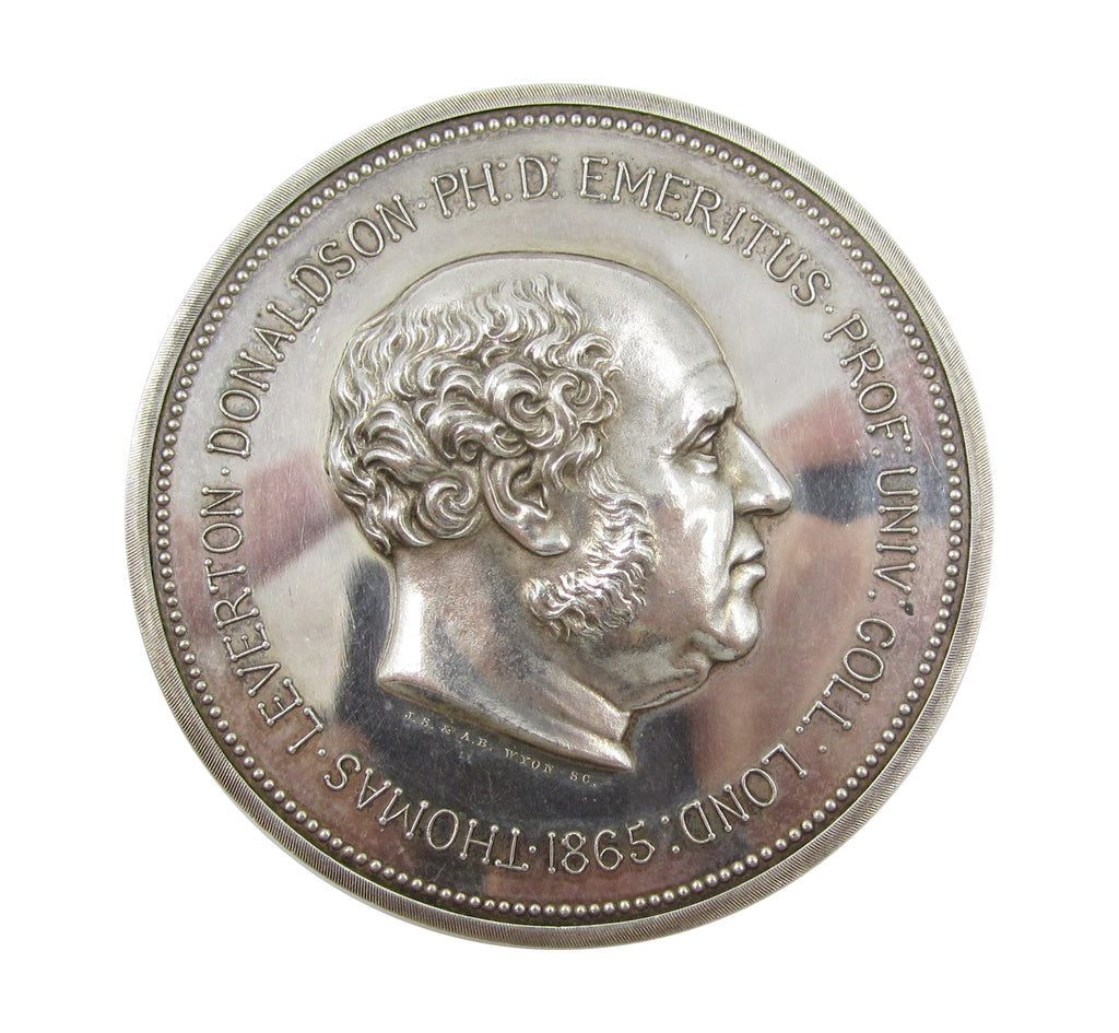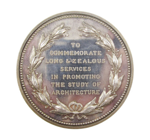 Obverse with head of Thomas Leverton Donaldson. Reverse with 'To Commemorate Long & Zealous Services In Promoting The Study Of Architecture' within wreath. Edge named to 'Michael James Peto, A.R.I.B.A. 1951'.