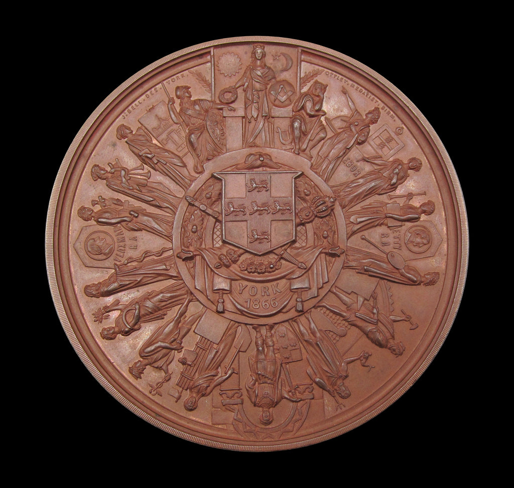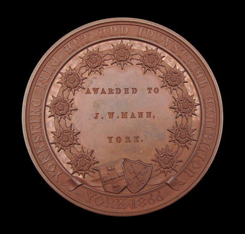 Obverse with coat of arms and figures around the perimeter representing figures such as the Muses of History, Music and Medicine. Reverse engraved within decorative border 'Awarded To J.W Mann, York'.