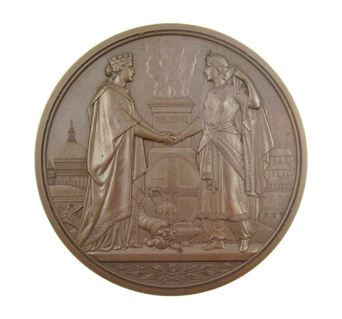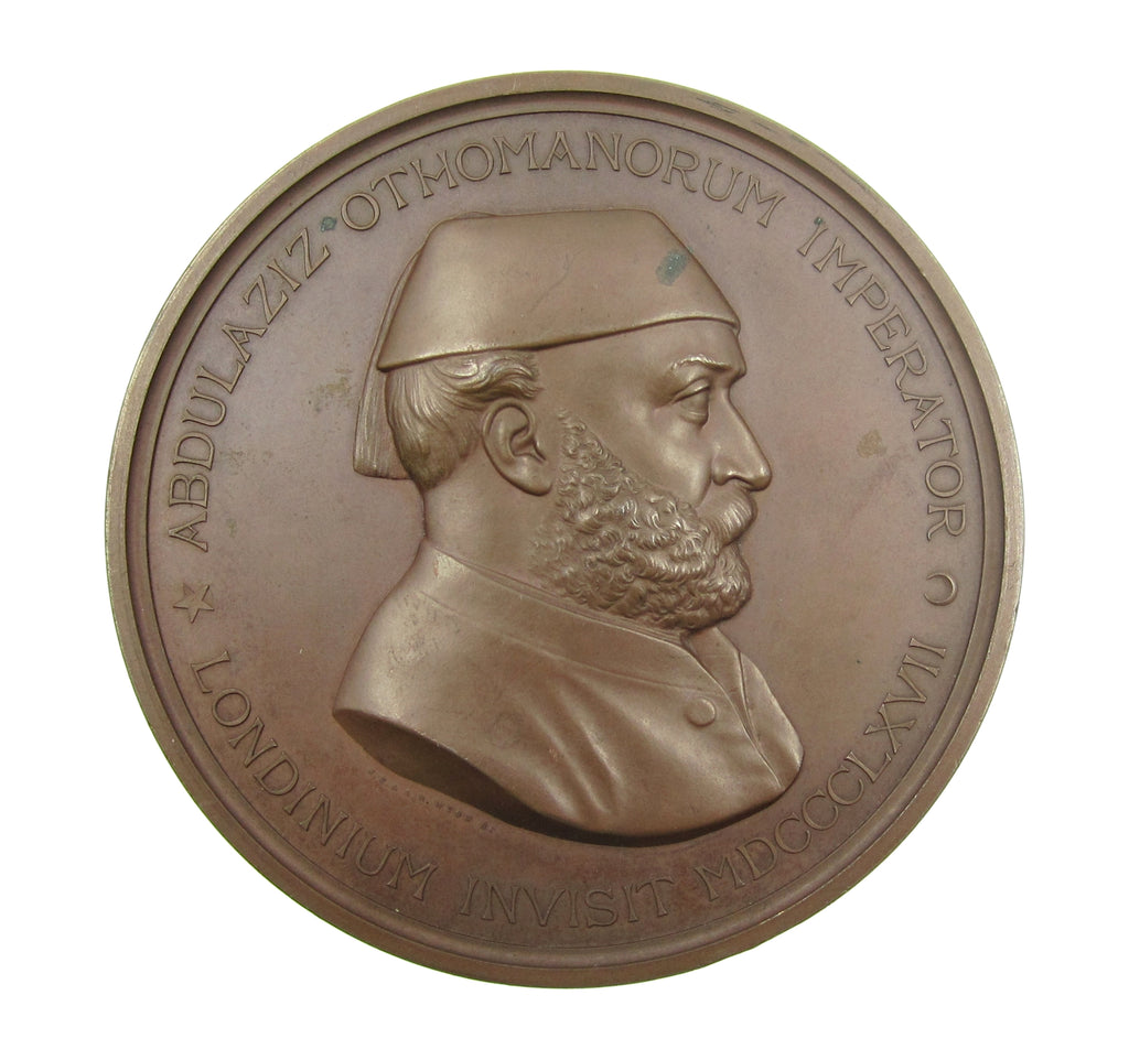 Obverse with bust of Abdul Aziz, Sultan of Turkey, reverse with Londinia standing before a burning altar decorated with the City shield and greeting the figure of Turkey. Issued by the Corporation of London.