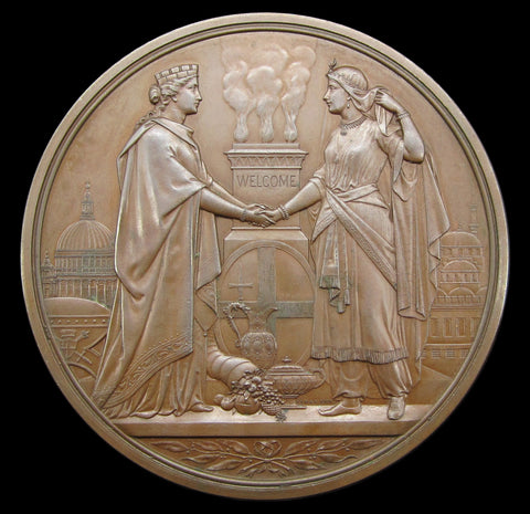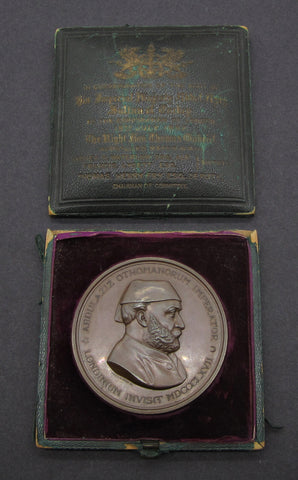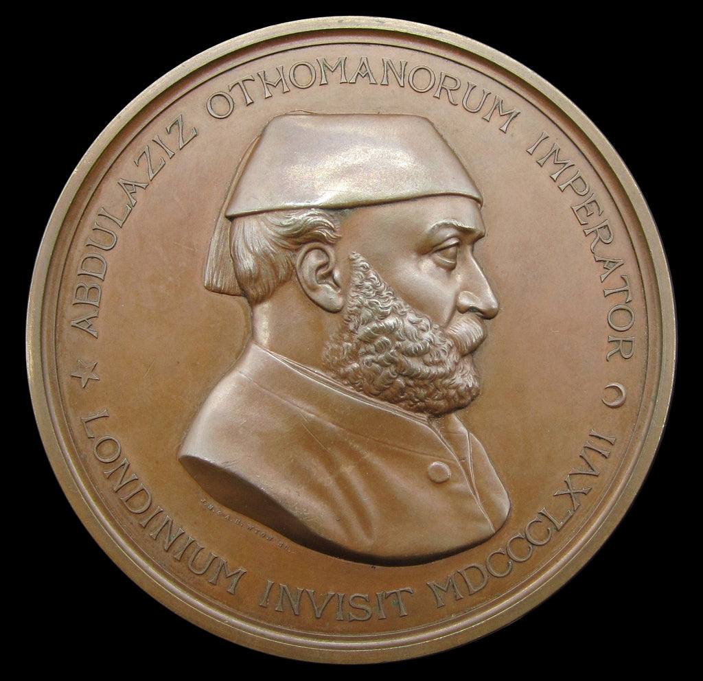 Obverse with bust of Abdul Aziz, Sultan of Turkey, reverse with Londinia standing before a burning altar decorated with the City shield and greeting the figure of Turkey. Issued by the Corporation of London.