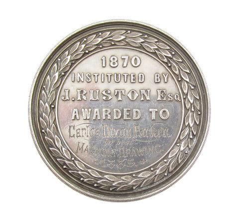 School of Art, Lincoln, The Ruston Medal. Obverse with coat of arms above wreath, reverse engraved within wreath 'Carlos Dixon Parker - For Best - Machine Drawing - 1885'.