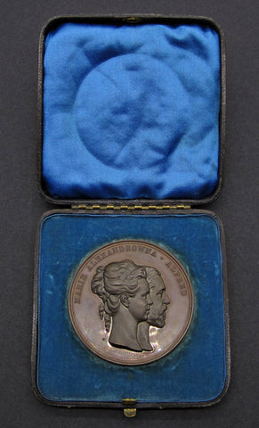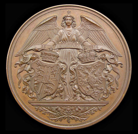 Obverse showing conjoined busts of Alfred, Duke of Edinburgh and Marie Alexandrowna of Russia. Reverse showing angel standing upon the crowned shields of the couple.
