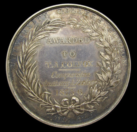 University College London silver prize medal awarded to 'T.A Colfox, Comparative Anatomy & Zoology, 1875-6'.