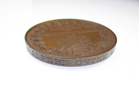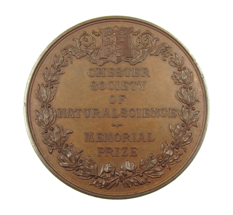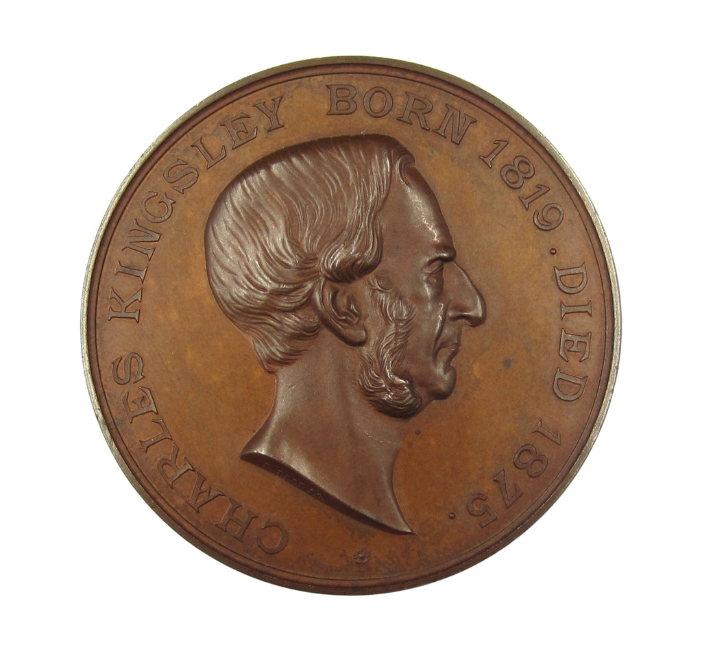 Obverse with bare head of Charles Kingsley, reverse with inscription within open wreath. Edge engraved 'Presented to Alfred Osten Walker, F.L.S, 1884'.