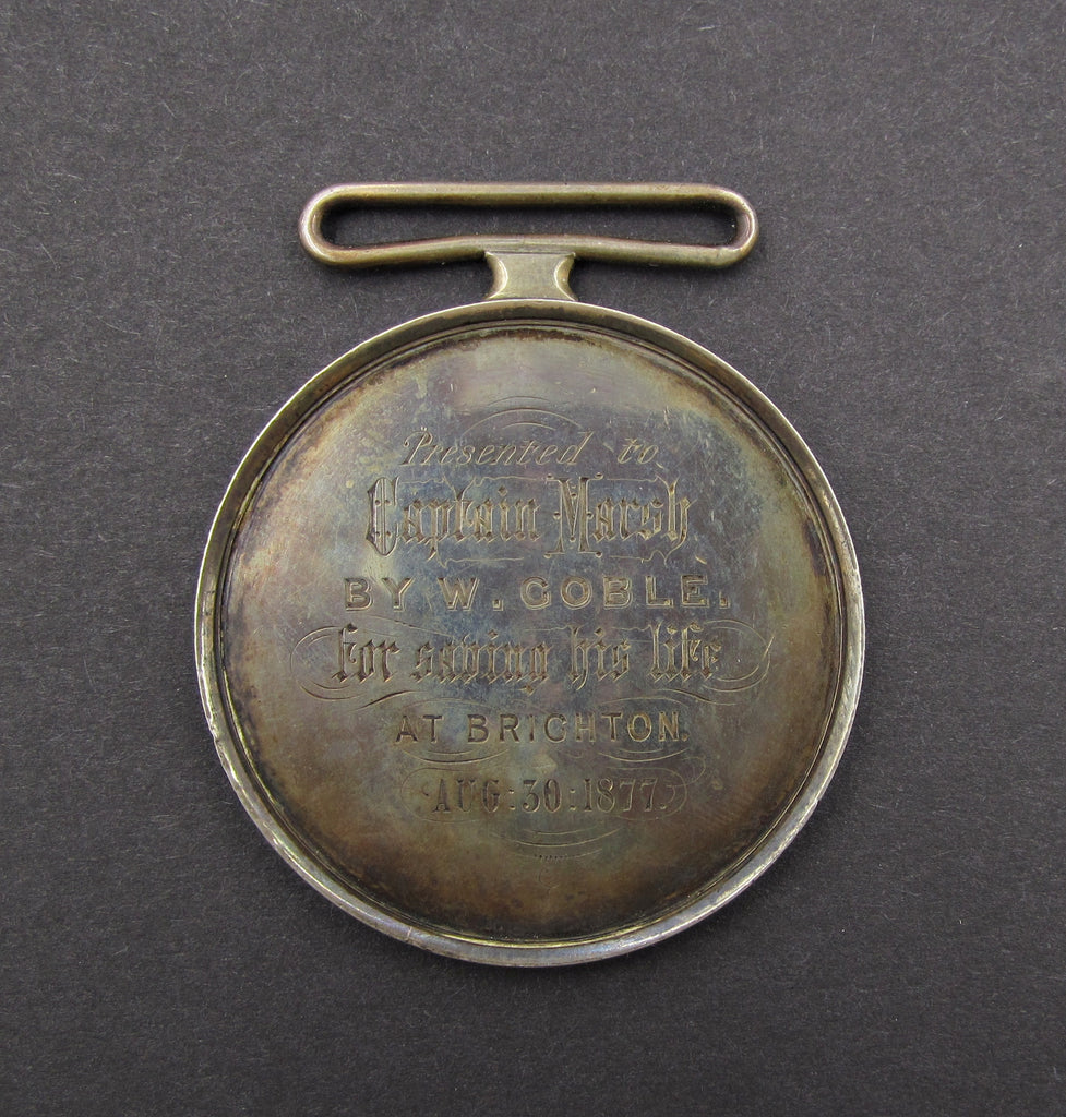 Plain on one side, other side engraved with “Presented to Captain Marsh by W. Goble for saving his life at Brighton. Aug 30 1877”.