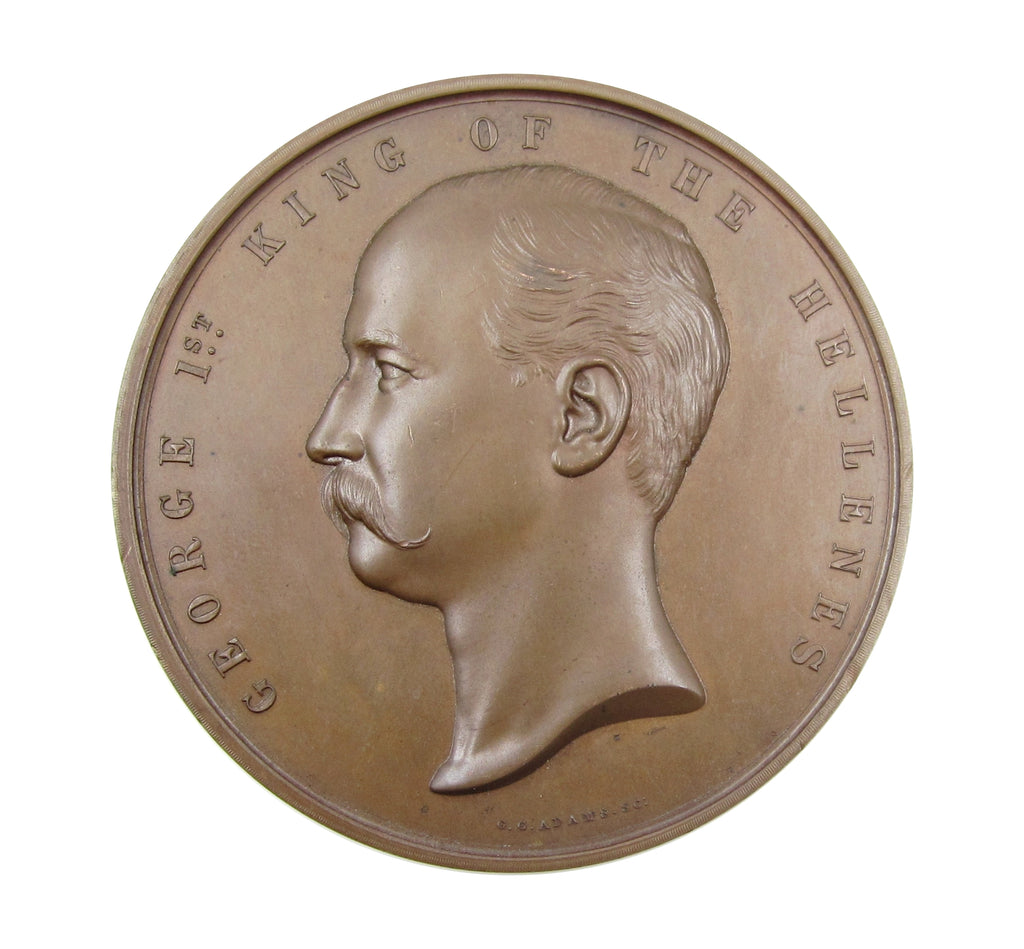 Issued by The Corporation of London. Obverse with bare head of George I of Greece, reverse showing Londinia, accompanied by Britannia, welcoming Hellas.