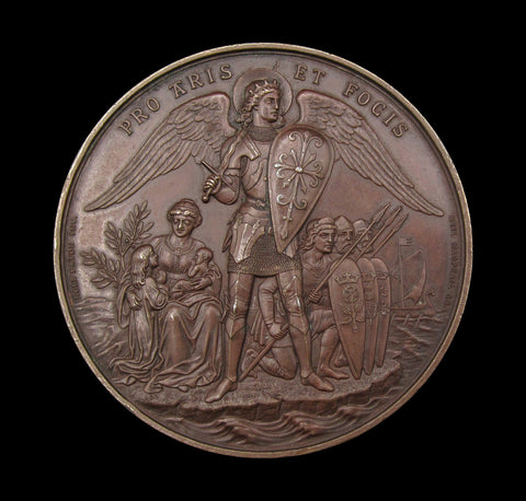 Obverse with crowned bust of Victoria, reverse showing St Michael standing at the edge of an island, on which are armed knights and a female figure with two children.