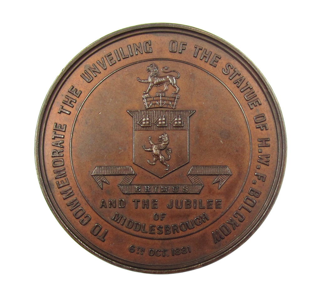 Obverse showing statue of H.W Bolckow (first member of Parliament for Middlesbrough), reverse with arms of Middlesbrough within legend.