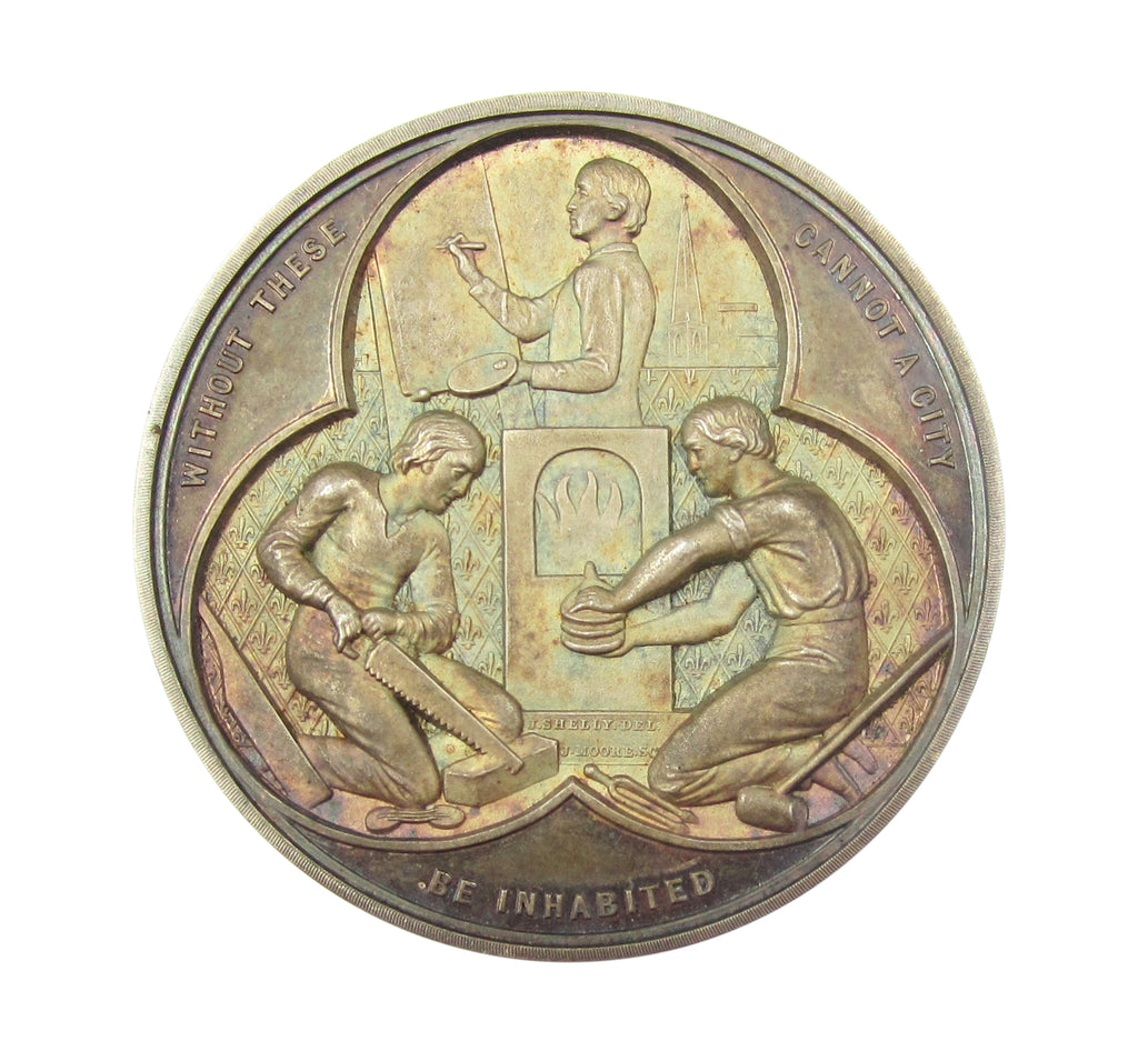 Obverse with a trefoil in which are three male figures engaged in labours of art and industry, reverse with 5 line legend within wreath.